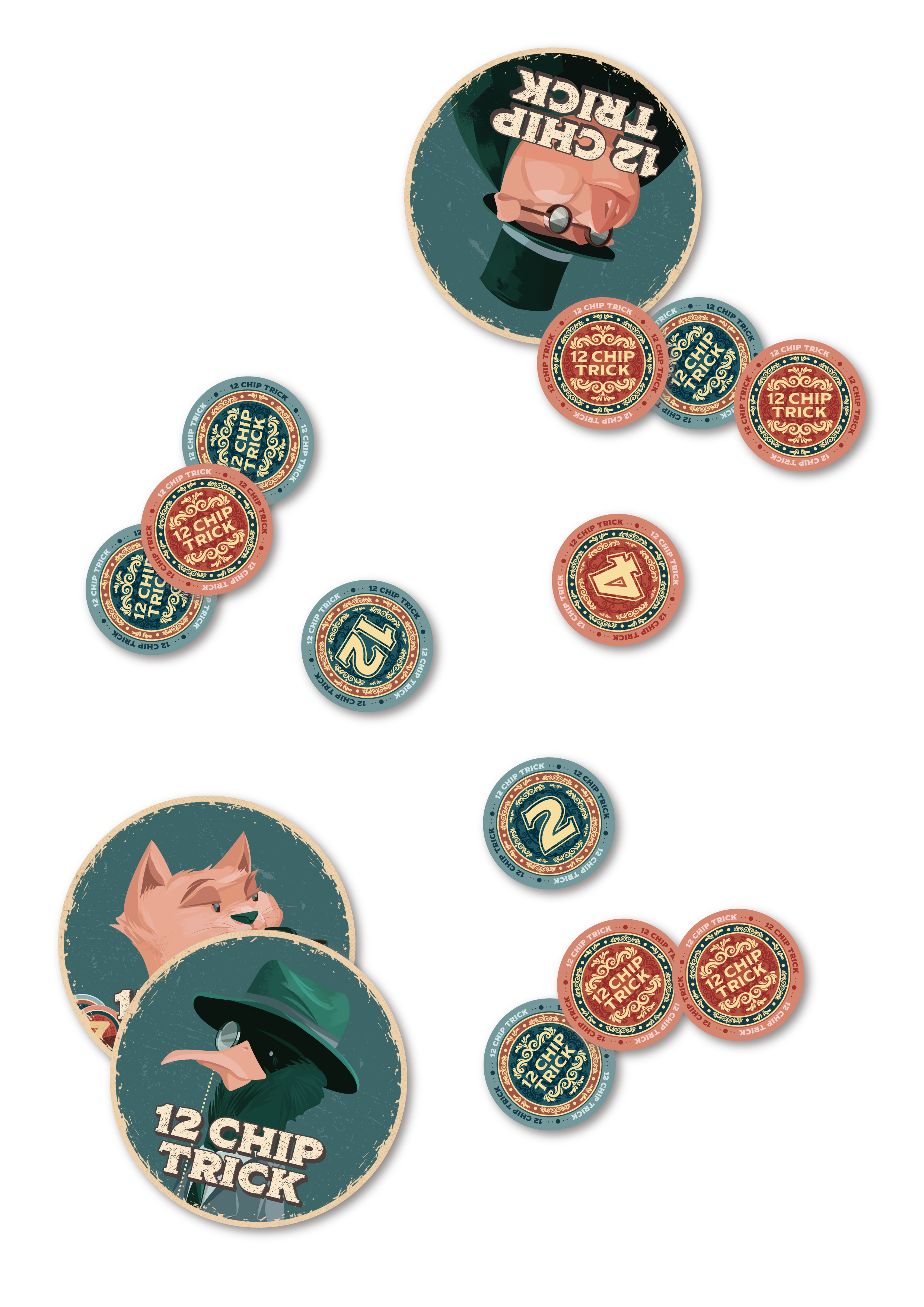 The game uses chips, half red and half blue, numbered 1 to 12. It is a “may follow” game where the players draft the chips played to the trick back to their hands. The winner takes a chip face up, not to be used again. The other players take chips face down, into their hand.