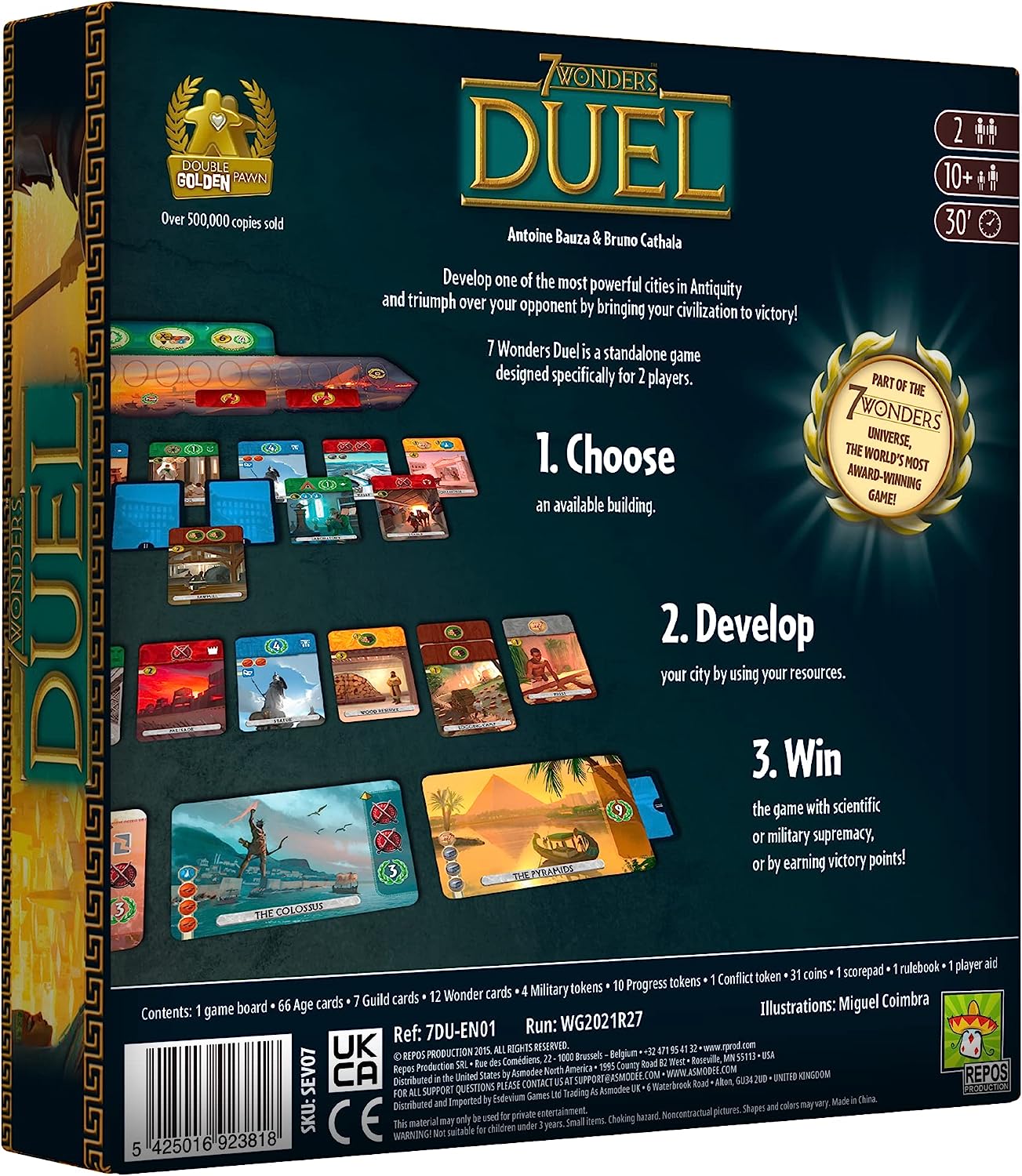 One of the most celebrated games in the world can now be experienced in a two-player arena.7 Wonders Duel takes the game play and excitement of the original and adapts it for one-on-one battles. Take control of your civilization and decide to invest in science, military or prestige. Two New ways to win will keep you on your toes and watching every move your opponent makes. If you fail to build defenses your capital city may be destroyed, but ignore technology and your people may be left in the dark ages. It’s a constant tug of war.7 Wonders Duel is an exciting New way to play the game that took the world by storm. Great for both fans of the original and those New to the hobby.
