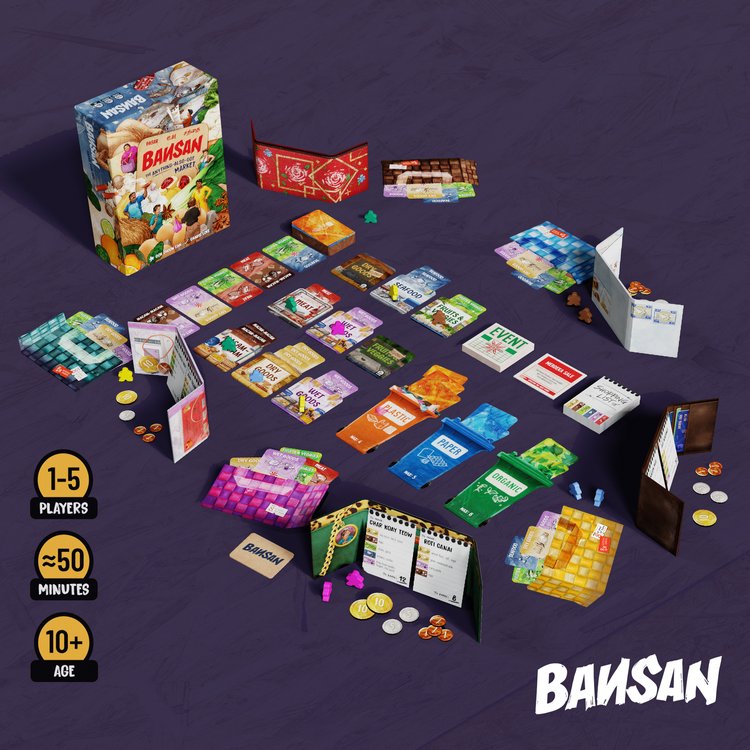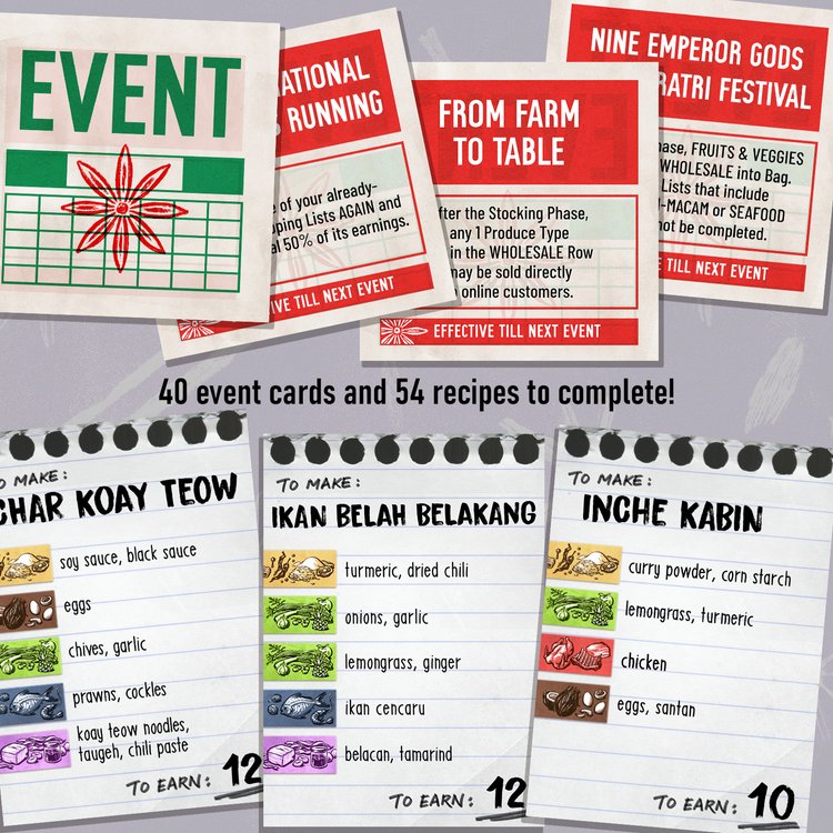 On your turn, you choose a number of actions in order to optimize how much income you make. The vendor who generates the most money at the end of the game wins. Fellow vendors as well as 40 Malaysian-flavoured events and 54 recipes make a different game experience each time and can either help or disrupt your strategies of becoming the best Bos Bansan!