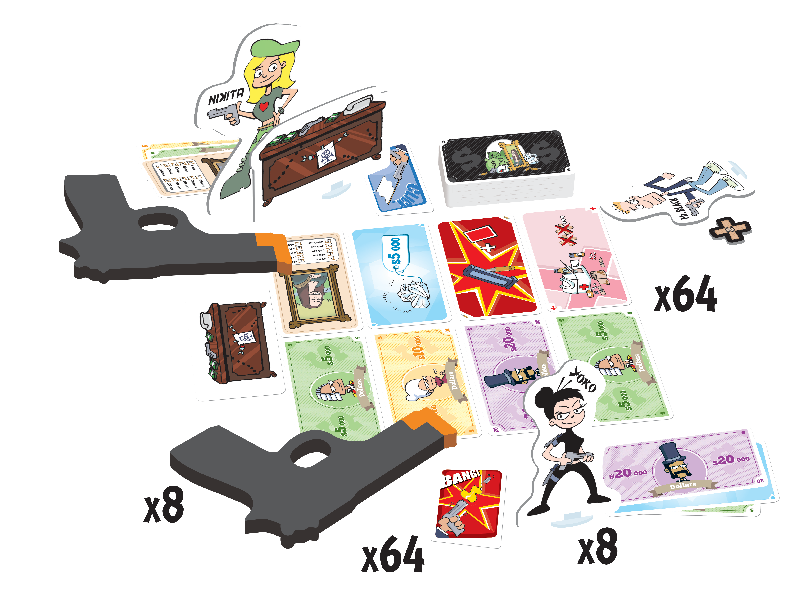 In Ca$h ‘n Gun$ (Second Edition), players will point foam pistols at each other and try to intimidate their opponents into letting them have the largest share. The bravest crooks enjoy the most money – but only if they live long enough to spend it!