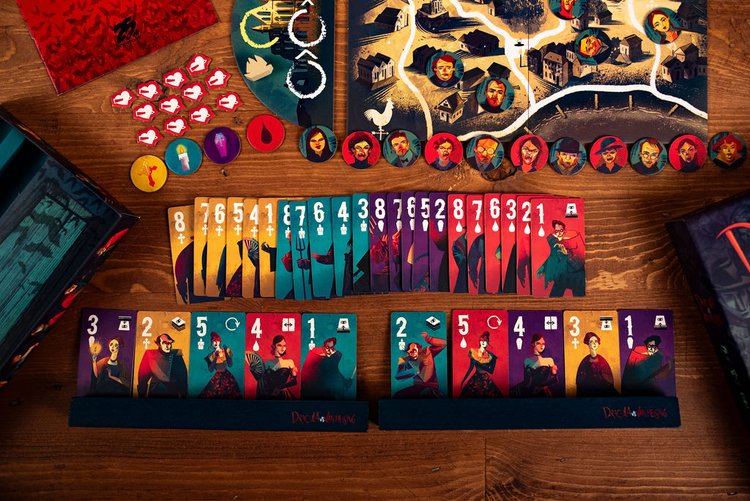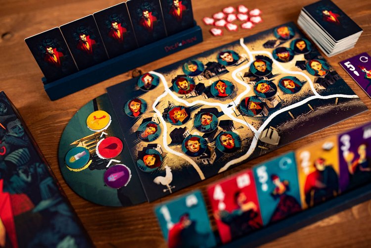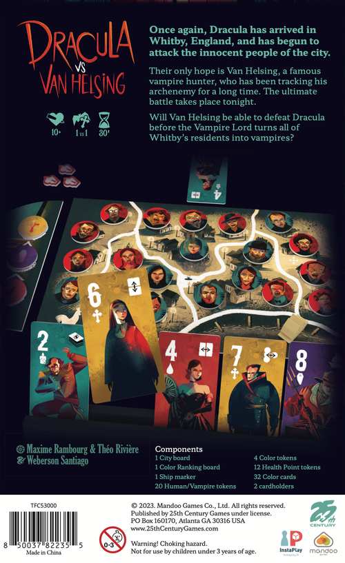 In Dracula vs Van Helsing, each player controls one of the title characters. Van Helsing must remove all of Dracula’s life points to win, but if Dracula turns all four inhabitants of the same district into vampires first, Dracula wins.