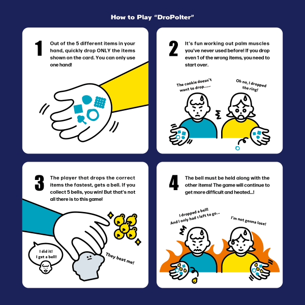 While holding 5 different kinds of items in your hand, if you are able drop only the correct items shown on the theme card using only your one hand, faster than any of the other players, you win! You might be thinking, “That’s all there is to it?”, but it’s surprisingly difficult. If you accidentally drop the wrong item, you fail, so you will need to skillfully use your finger and palm muscles to sort through the items. On top of that, if you are successful, a tiny bell will be added to your items which will quickly cause the situation in your palm to spiral out of control. With its simple rules that anyone can quickly pick up, this is a fresh party game that will cause children and adults alike to scream in excitement.