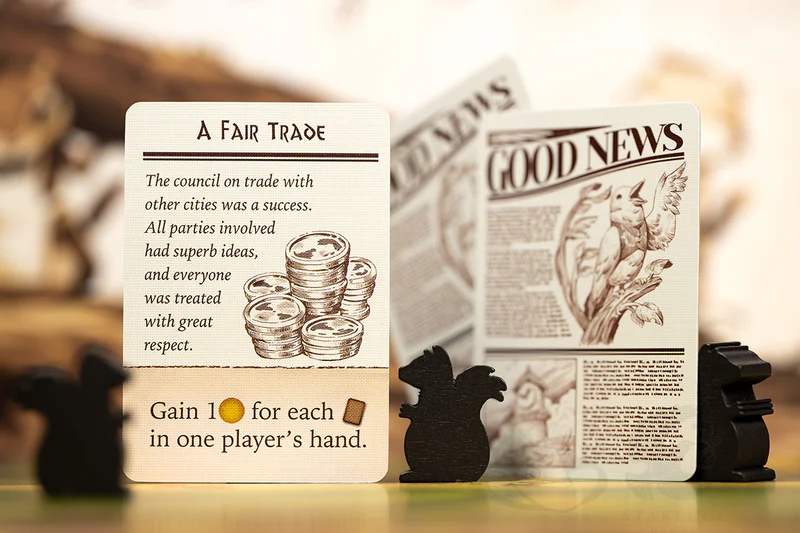 Cards may be played from your hand or from the face-up area on the board called the meadow. However, only cards touching the sun or moon token may be played from the meadow, and players move these tokens each time they perform a turn. Therefore, planning for and timing which cards you play is critical.