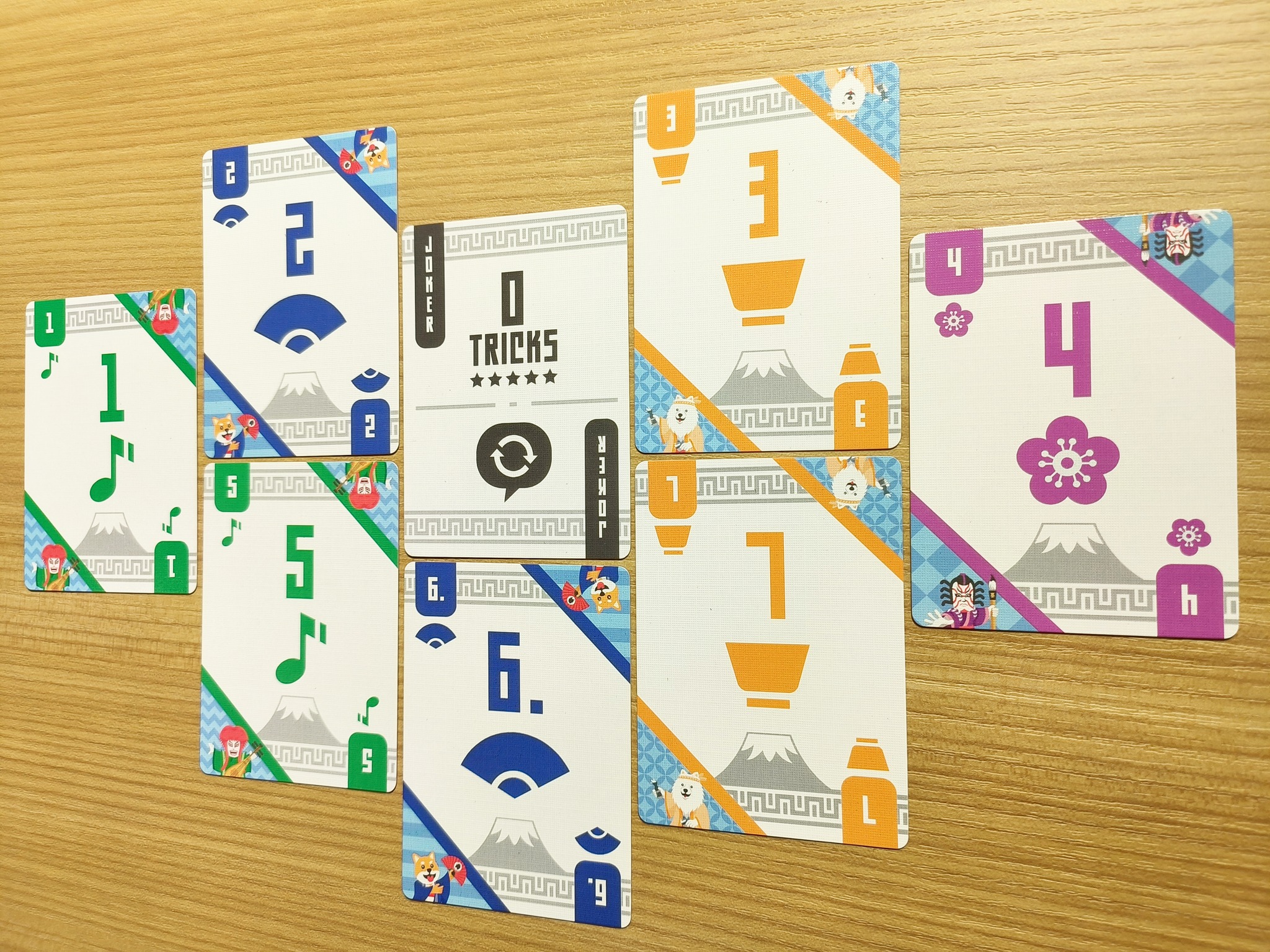 - 7 Tricks – A player starts a trick by choosing to play a Suit card face-up, then the rest of the players play one of the Suit cards from hand (including a Joker card). The round ends when players finish 7 tricks, leaving only 1 card on hand.