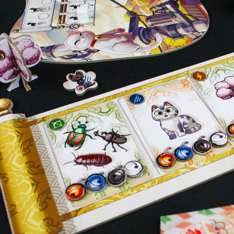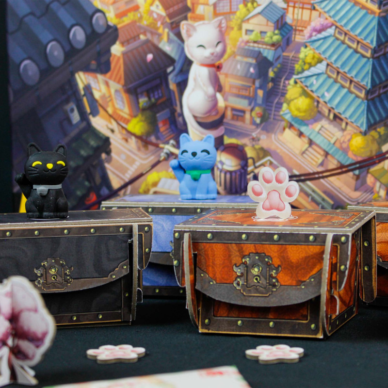In Kyoto no Neko, 2 to 4 players are kittens who explore the modern-day city of Kyoto, Japan through a series of independent, replayable scenarios. In each scenario, players must fulfill a variety of missions, from befriending a school boy to fighting an aggressive stray cat, or stealing the food from other player’s dinner bowl. Throughout the game, each player will evolve, developing their skills and gaining the ability to explore new parts of the map by climbing on bushes and rooftops.