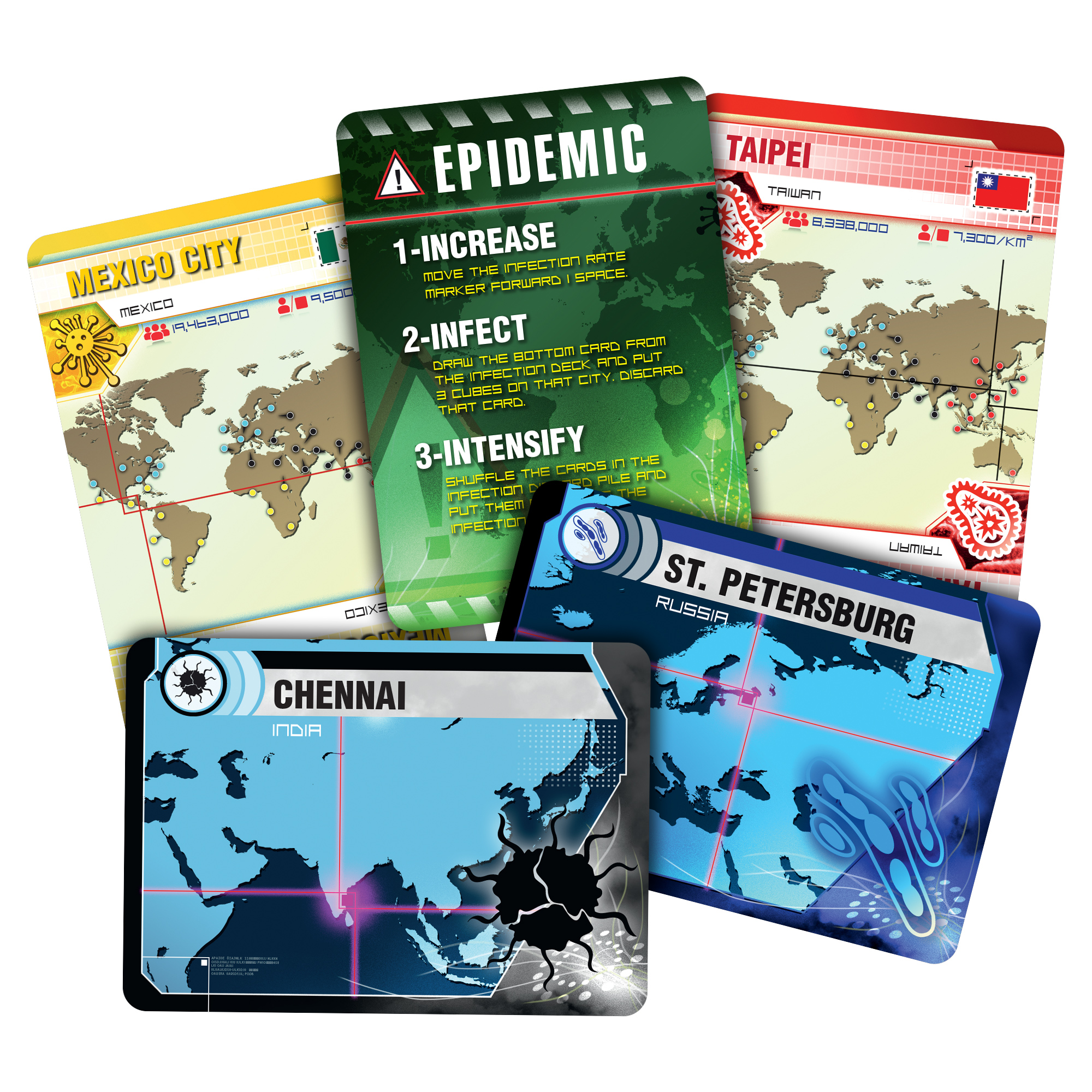 You and your team are the only things standing in the way of deadly diseases that threaten the world. The fate of humanity isin your hands. From designer Matt Leacock, Pandemic is a cooperative game of teamwork for two to four players. As members of an elite disease control team, you must keep four deadly diseases at bay. Work together as you travel the globe to treat infections while collecting the cards you need to discover a cure for each disease. But the clock is ticking as outbreaks and epidemics fuel the spreading plagues. As a cooperative game, players win or lose together. Only by working together can you keep the out breaks in check and find the cures in time