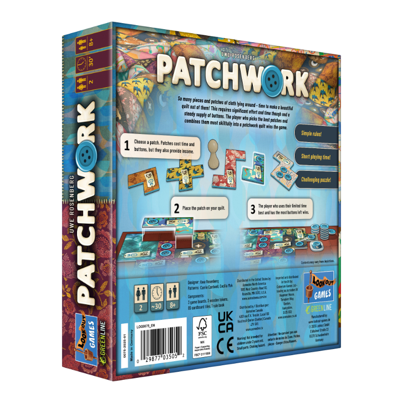 Game play, rules and the fun this game brings to your tables, stay the same. With the 2025 edition, Patchwork joined our ever growing range of eco-friendly manufactured boardgames, FSC-certified and plastic free! Thats why this Lookout classic now features a new cover.