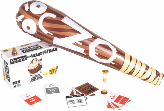 Poetry for Neanderthals is a family-friendly party game similar to Taboo® where players earn points by getting their teammates to guess words and phrases. The catch is that they can only use single syllable words to give clues. If they use any words with more than one syllable, the other team gets to bop them with a 2-foot inflatable club.