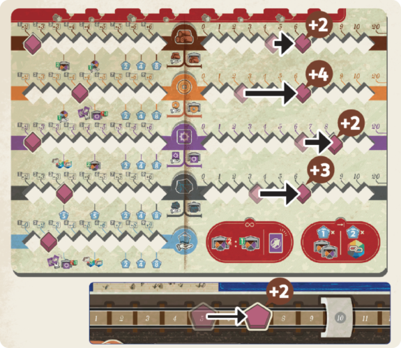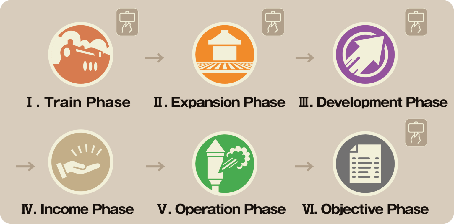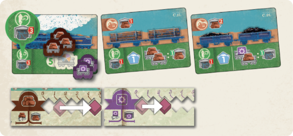 In this phase, Players will load up their locomotives with resource tokens and spend the necessary coal resource to leave the station. Optimize the carriages connected to the locomotive to create the most synergy with the cargo, producing g a huge amount of resources if you can find the right combination!