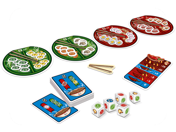 ENHANCED COMPONENTS: The game includes 5 dice, 14 Ramen Bowl cards, 48 ingredient tokens, 5 Chopsticks tokens, 5 Chili Heat cards, and 5 Chili Pepper tokens, providing everything you need for an immersive playing experience.