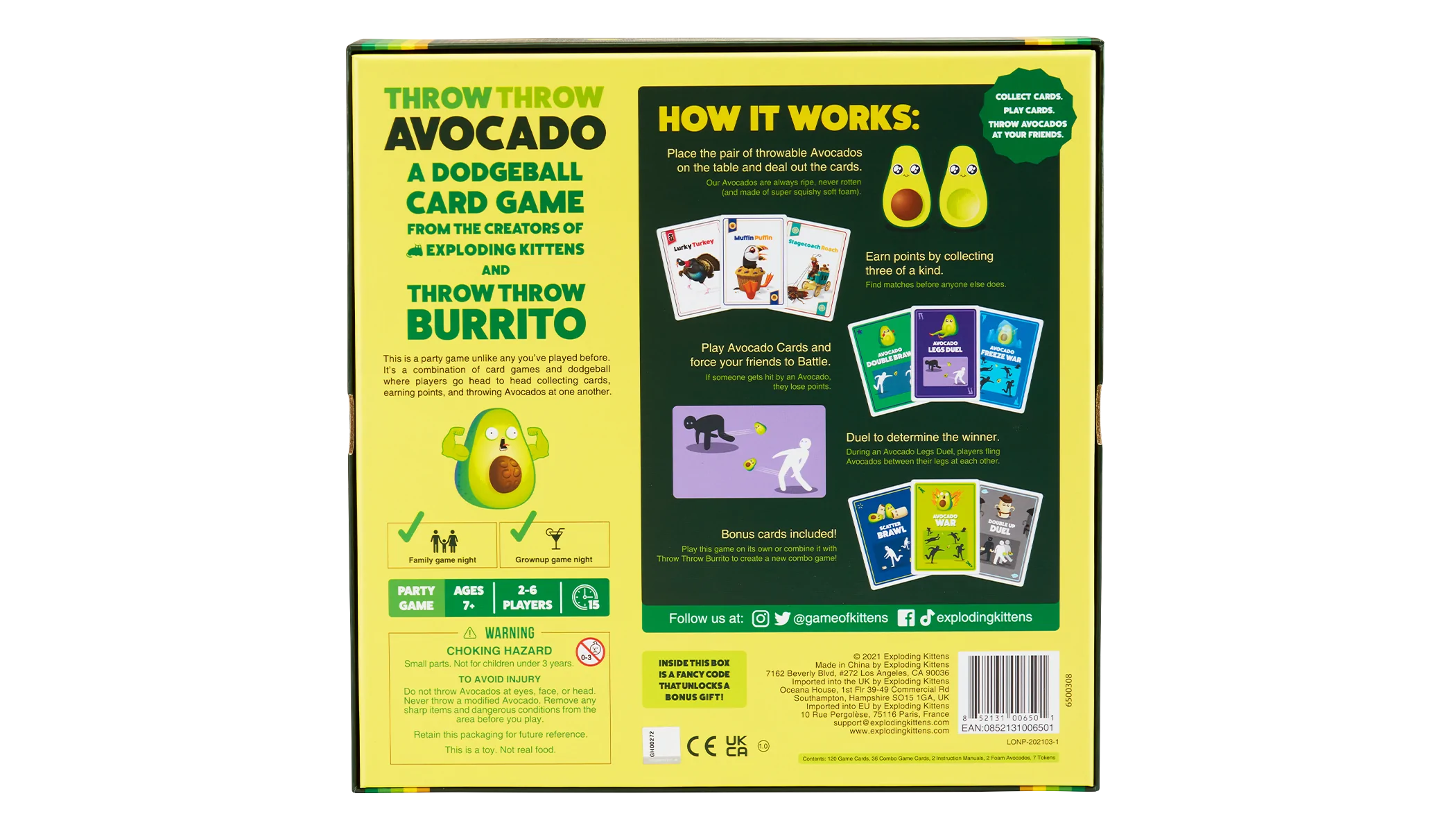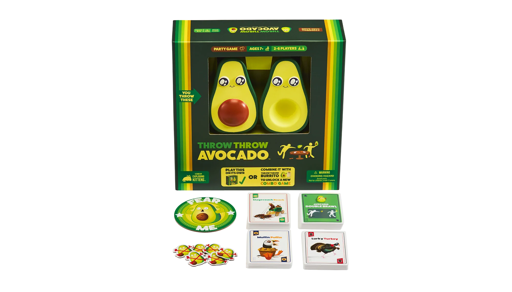 Place the pair of throwable Avocados on the table and deal out the cards. Earn points by collecting three of a kind. Play Avocado Cards and force your friends to battle. Duel to determine the winner. Duck, dodge, and dive squishy, airborne avocados or get hit and receive an Avocado Boo Boo!