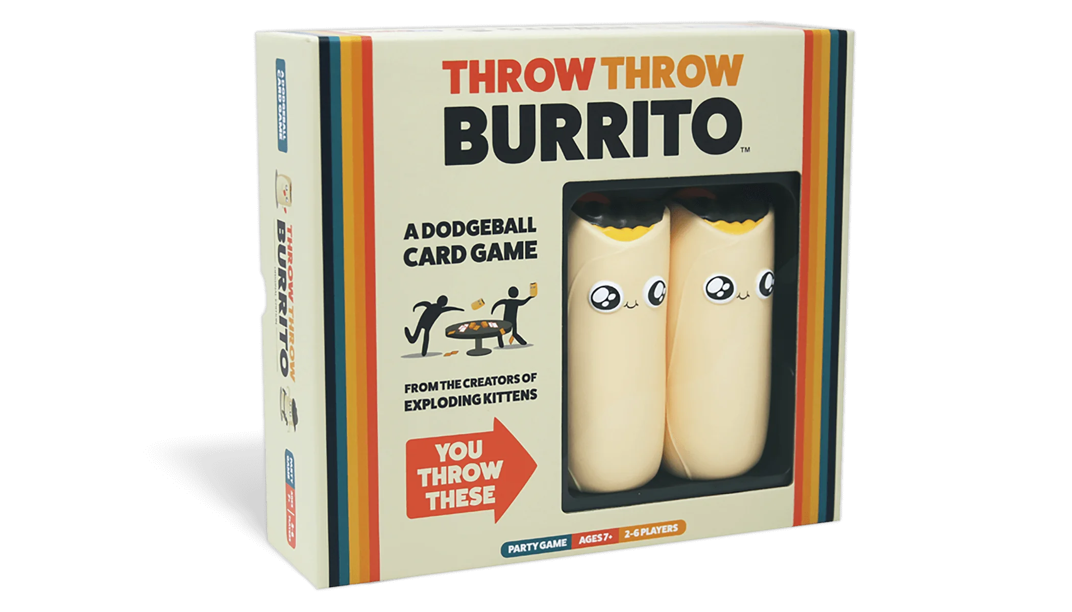 Throw Throw Burrito is what you get when you cross a card game with dodgeball. Try to collect matching sets of cards faster than your opponents while simultaneously ducking, dodging, and throwing squishy airborne burritos. The cards you collect earn points, but getting hit by flying burritos loses them. So clear some space and put away the antiques, because you’ve never played a card game quite like this before.
