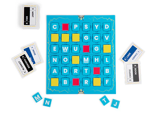 Break into two teams. Shuffle the Letter Tiles and place them on The Board until it’s full. Pick one person from each team to be the Guesser. It’s your team’s job to get your Guesser to say the word from the Word Card by giving them a two word clue that starts with letters from The Board. For example, if your word is “Penguin,” your team might decide to give “Snow Bird” as a clue. But hurry, because if the other team yells out a clue first, their Guesser can guess before yours. If they get it right, that team gets to flip over the letters they used for a clue (Ex. if the winning clue is “waddling tuxedo,” they’d flip over “w” and “t”.) The team that flips 5 letters in a row wins.