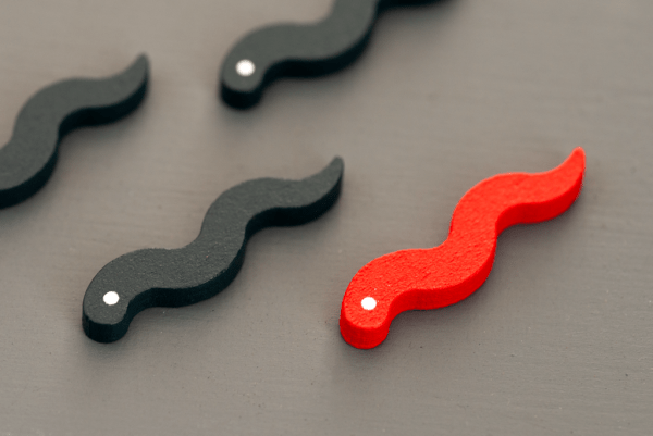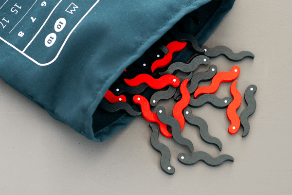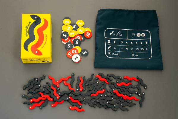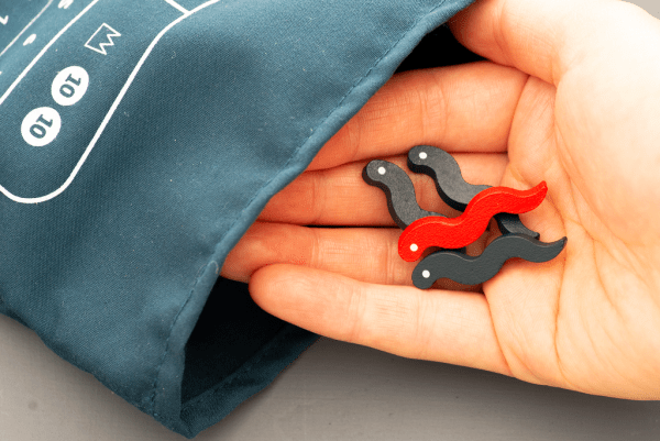 The game is brought to life by its colored wooden pieces shaped like eels and snakes. Inside the bag are 68 small, 35mm-long pieces—black eels and red snakes. Though their colors differ, the wooden pieces share the exact same wiggly shape. Rattling them around in the bag and feeling your way through as you play makes for a truly suspenseful, sweaty-palmed experience! And when everyone opens their hands at once—a burst of excitement.