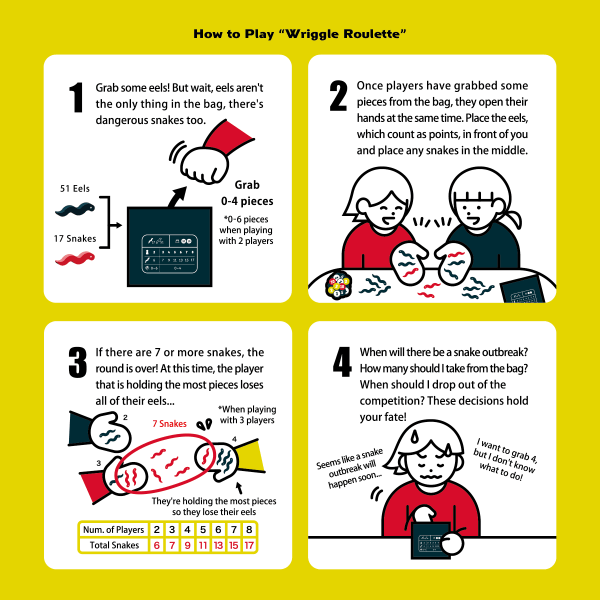 “Wriggle Roulette” is a tabletop game blending luck and strategy. Players take turns reaching into a bag filled with eel and snake-shaped wooden pieces, trying to pull out as many eels as possible. But beware—if the number of snakes grabbed by all players exceeds the limit, a “snake outbreak” occurs, and the player who grabbed the most pieces loses all of their eels. You want to grab more than everyone else to score big, but a snake outbreak would be devastating…