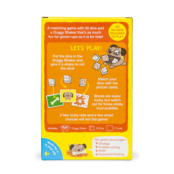 To play, place the dice in the doggy shaker, give it a shake, and roll the dice. Match your dice with the picture cards. Bones are super lucky, but players must watch out for stinky mud puddles. A few lucky rolls and a few smart choices will win the game!